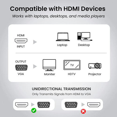 Plug-and-Play Convenience: Enjoy hassle-free usage with no need for additional drivers or power sources; simply plug it in and start using your HDMI device with a VGA display instantly.
