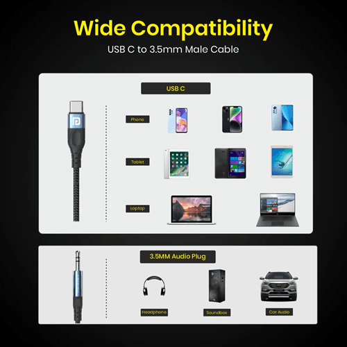 Portronics Type C to AUX Cable can easily connect your Type C devices to car stereo, speakers, headphones or any device with 3.5mm audio jack or Aux-in port. No drivers or apps required, just easily plug and play. Let the music never stop.