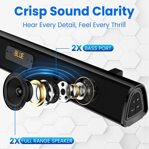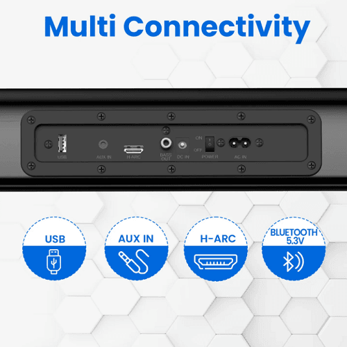 Plug and Play Connectivity: Experience immersive audio with the soundbar’s wired connection options, including AUX-In, HDMI port, and USB Drive port, allowing you to effortlessly connect any audio source.